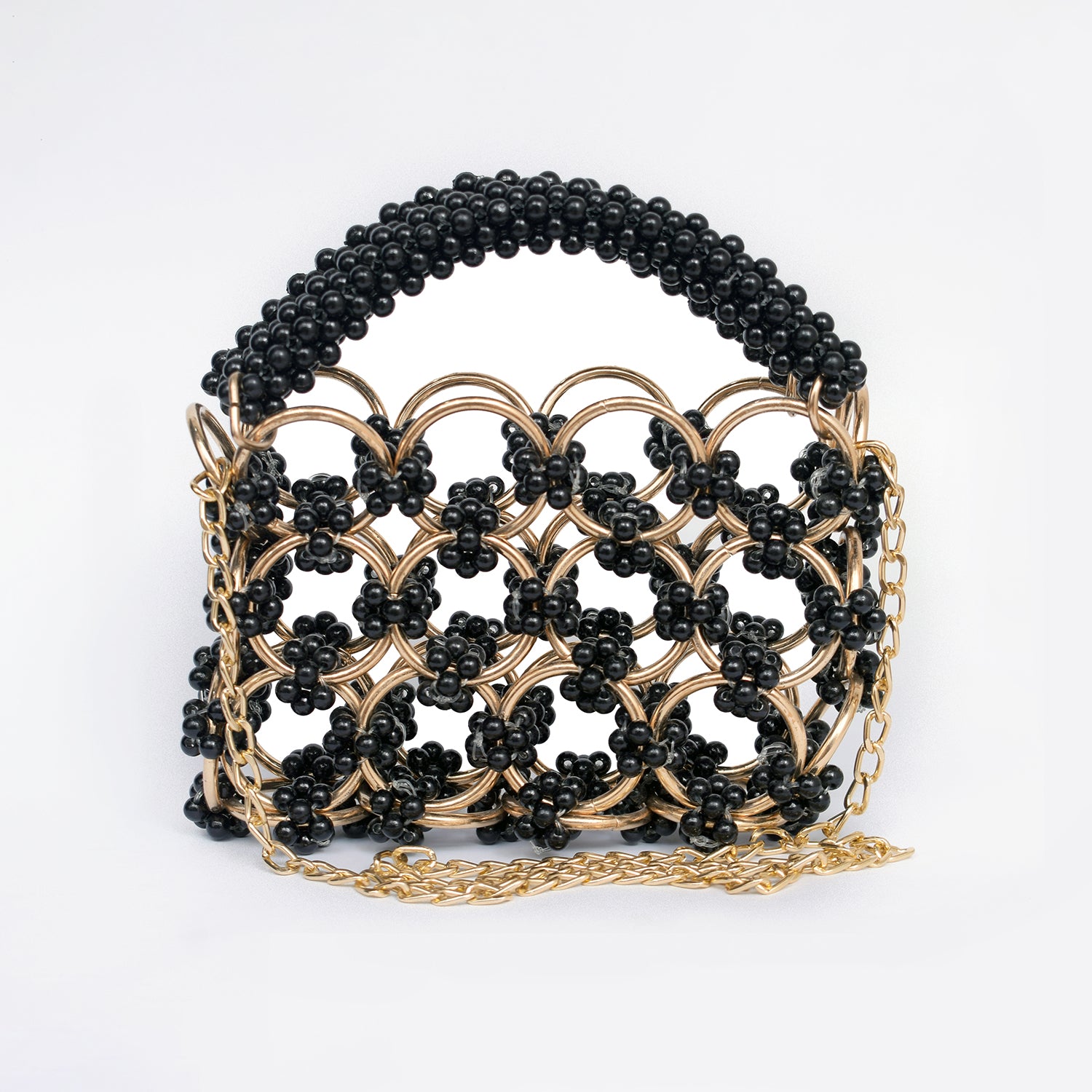 Make a statement with our Black Beaded Ring Bag — a perfect blend of craftsmanship and modern glam. Featuring intricate black beading woven through gold-toned metal rings, this bag brings an elegant, eye-catching texture to your look.