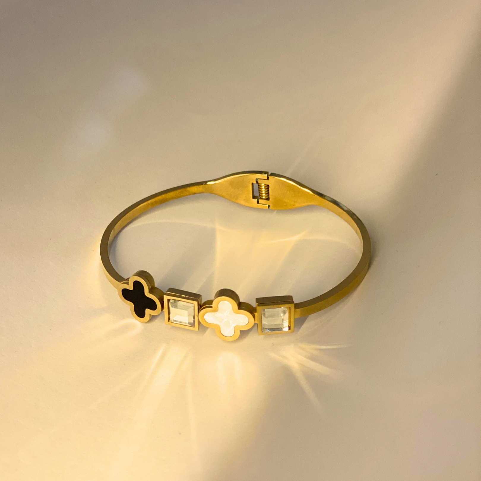 Refined and radiant, the Nikdur Luxe LEAF CUFF Bangle blends durability with sophisticated design. Expertly crafted from high-grade stainless steel with a lustrous 18K gold-plated finish, this bangle resists tarnish and retains its shine for long-lasting elegance. The design features a harmonious sequence of black and white enamel quatrefoils alongside precision-cut cubic zirconia stones, capturing light and attention with every movement. Its secure clasp mechanism ensures a comfortable and confident fit, making it an ideal accessory for both everyday luxury and special occasions.
