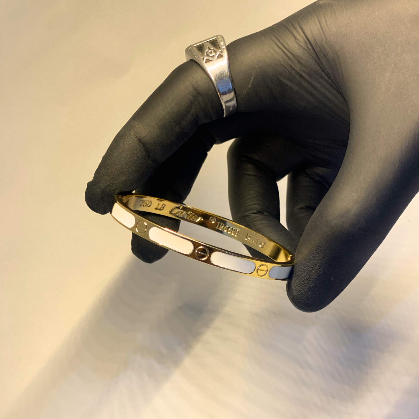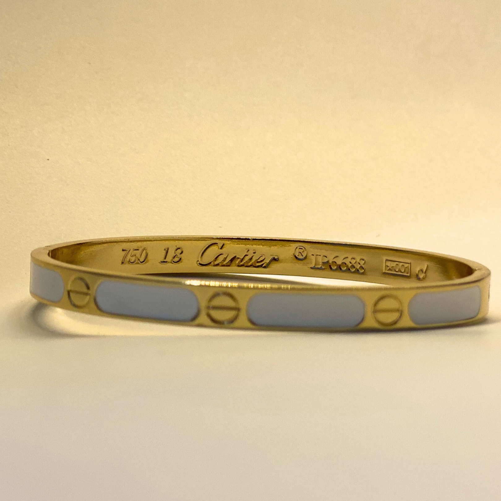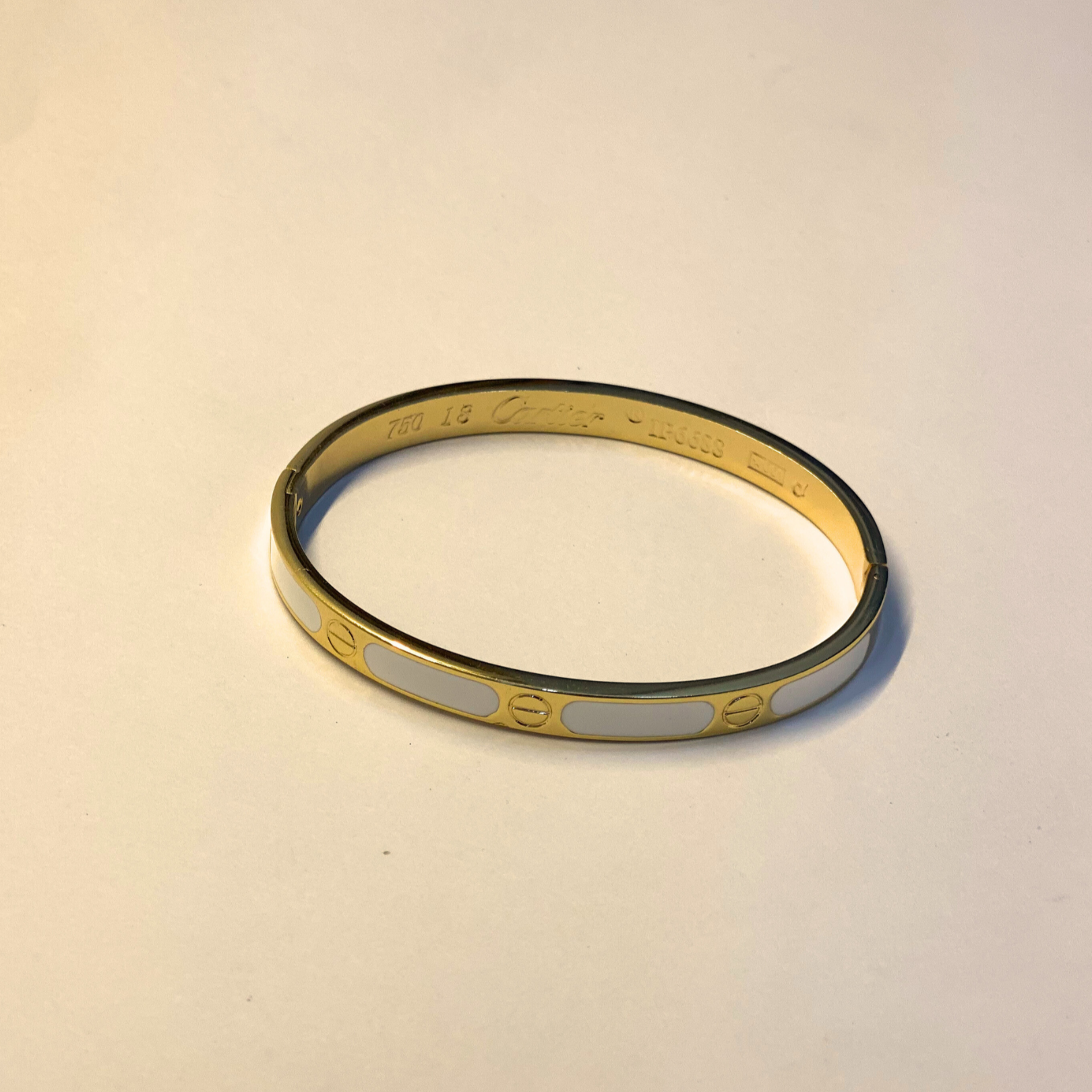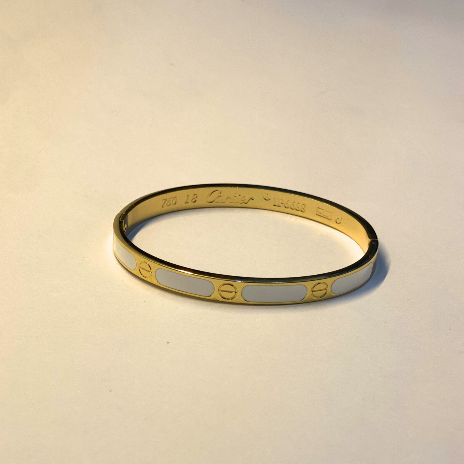 Crafted from 18k yellow gold (750), this Screw Studded Cuff features the iconic screw motif with white enamel inlays. The inner band is engraved with the Cartier logo and hallmark stamps. A sleek, elegant symbol of timeless love.